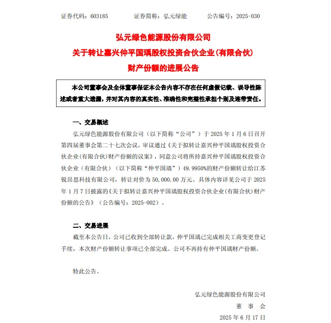 翻開(kāi)弘元綠能近期公告,一條關(guān)鍵信息映入眼簾:公司已正式完成對(duì)嘉興仲平國(guó)瑀49.995%股權(quán)的轉(zhuǎn)讓?zhuān)瑥氐淄顺龈甓魉鼓茉吹耐顿Y鏈條。