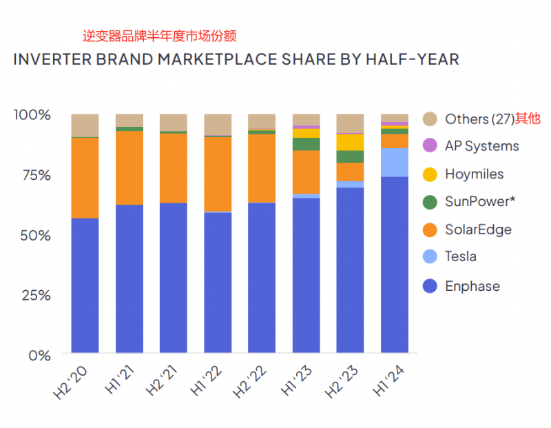 當然,也不要忽視本土逆變器巨頭的實力。Enphase、SolarEdge等本地品牌憑借專利、渠道和服務優勢牢牢占據市場。其占有率多夸張,從下圖中可見一斑。