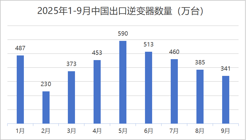 中國海關總署最新發布的2025年9月份逆變器出口數據顯示:2025年1-9月中國海關出口逆變器累計3832萬臺,其中9月出口341萬臺,環比同比均有所下降。