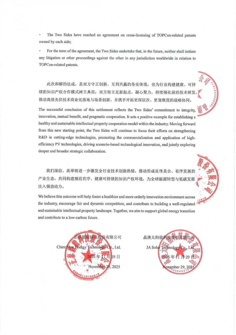 根據(jù)和解協(xié)議,雙方同意:終止在全球范圍內(nèi)正在進(jìn)行的全部專利糾紛法律程序,并就雙方各自持有的TOPCon專利達(dá)成交叉許可;而且雙方承諾,在全球范圍內(nèi)不再就TOPCon專利向?qū)Ψ教崞鹑魏螌@嚓P(guān)的訴訟或其他程序。