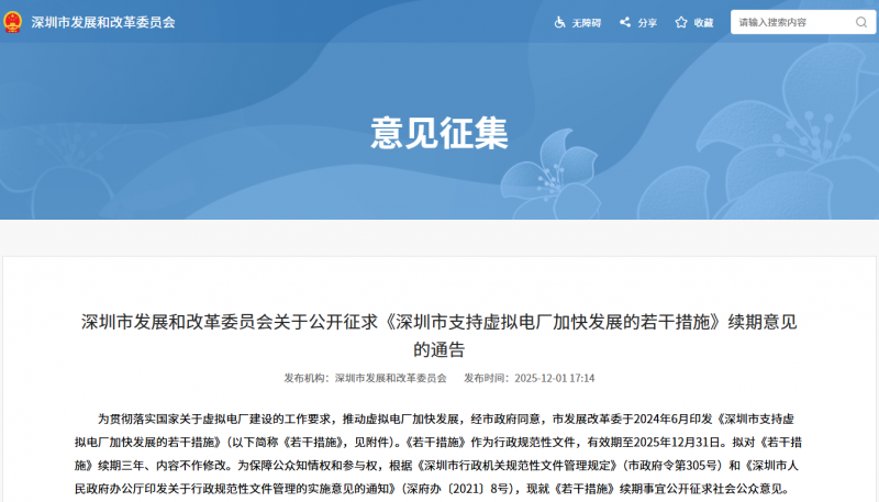 深圳市發展和改革委員會關于公開征求《深圳市支持虛擬電廠加快發展的若干措施》續期意見的通告