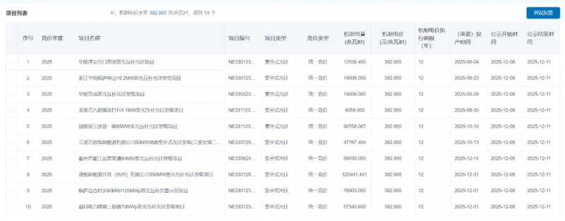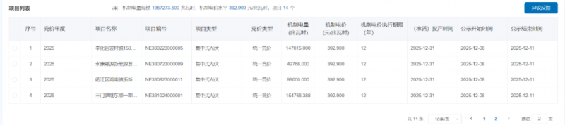根據公示,2025年統一競價項目競價出清結果:機制電量規模13.572735億千瓦時,機制電價水平0.3929元/kWh,項目14個。
