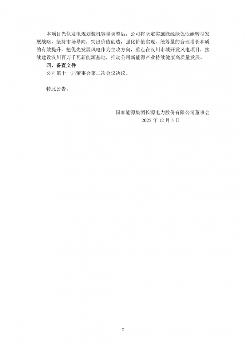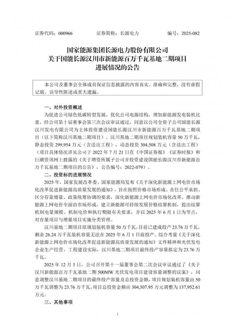 國能長源荊門市源網荷儲百萬千瓦新能源基地鐘祥子項目,因剩余300MW裝機容量無法在2025年6月1日前投產,長源電力決定將建設容量由600MW調整為300MW,投資金額由33.93億元調整為16.95億元。