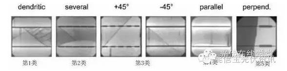 2011年,德國ISFH公布了他們的研究結(jié)果:根據(jù)電池片隱裂的形狀,可分為5類:樹狀裂紋、綜合型裂紋、斜裂紋、平行于主柵線、垂直于柵線和貫穿整個電池片的裂紋。