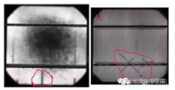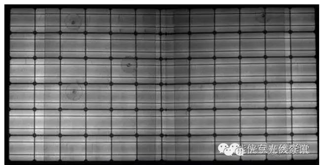 給晶硅組件施加電壓后,所激發(fā)出的電子和空穴復(fù)合的數(shù)量越多,其發(fā)射出的光子也就越多,所測得的EL圖像也就越亮;如果有的區(qū)域EL圖像比較暗,說明該處產(chǎn)生的電子和空穴數(shù)量較少,代表該處存在缺陷(復(fù)合中心);如果有的區(qū)域完全是暗的,代表該處沒有發(fā)生電子和空穴的復(fù)合,也或者是所發(fā)光被其它障礙所遮擋,無法檢測到信號。