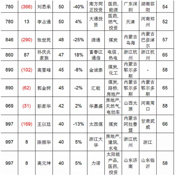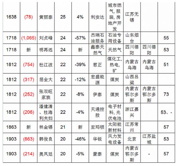 排名最后的是鄂爾多斯蒙泰集團奧鳳廷,總資產20億元,在全榜單中排名第1903位。上榜的能源企業家中,資產增長的有38位,43位資產則呈縮減態勢,新增企業家7位。