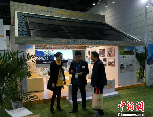 第八屆中國(無錫)國際新能源大會暨展覽會,參觀嘉賓在碩大的太陽能板下停留?!O權 攝