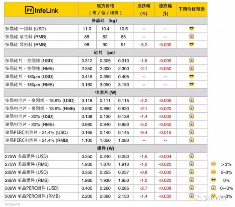 9月3日歐盟決定不在延長(zhǎng)MIP雙反措施,當(dāng)國(guó)內(nèi)光伏企業(yè)歡呼雀躍,大呼自己的產(chǎn)能迎來(lái)新的出??诘耐瑫r(shí),臺(tái)灣的電池業(yè)者可能怎么也高興不起來(lái),得益于貿(mào)易保護(hù)措施,東南亞地區(qū)的電池產(chǎn)能一直享受著區(qū)位布局帶來(lái)的超額收益,就以上半年歐洲地區(qū)為例,2018年H1出口歐洲地區(qū)的組件均價(jià)依然維持在36歐分(折合42美分)的高位,而現(xiàn)在貿(mào)易保護(hù)措施取消,國(guó)內(nèi)產(chǎn)能可以大規(guī)模沖擊歐洲市場(chǎng),在這之前,歐洲市場(chǎng)是臺(tái)灣產(chǎn)能得以殘喘重要根據(jù)地,而這塊曾經(jīng)讓人艷羨的市場(chǎng),伴隨著MIP的正式取消,瞬間變成了價(jià)格紅海,和駐扎歐洲的朋友聊天得知:此時(shí)輸往歐洲市場(chǎng)的組件價(jià)格已經(jīng)來(lái)到20~22歐分的地位,比起印度市場(chǎng),現(xiàn)在歐洲市場(chǎng)組件價(jià)格更貴的唯一邏輯是路途更遠(yuǎn),運(yùn)費(fèi)更貴。當(dāng)我們了解這樣的背景,就不難理解為何本周以美金計(jì)價(jià)的光伏產(chǎn)品跌幅更大、跌幅更猛啦。