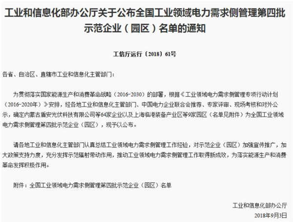 日前,工業(yè)和信息化部發(fā)布《關(guān)于公布全國工業(yè)領(lǐng)域電力需求側(cè)管理第四批示范企業(yè)(園區(qū))名單的通知》,確定內(nèi)蒙古盾安光伏科技有限公司等64家企業(yè)以及上海臨港裝備產(chǎn)業(yè)區(qū)等9家園區(qū)為全國工業(yè)領(lǐng)域電力需求側(cè)管理第四批示范企業(yè)(園區(qū))。該通知還要求各地工業(yè)和信息化主管部門認真總結(jié)工業(yè)領(lǐng)域電力需求側(cè)管理工作經(jīng)驗,推動工業(yè)領(lǐng)域電力需求側(cè)管理工作取得新成效。