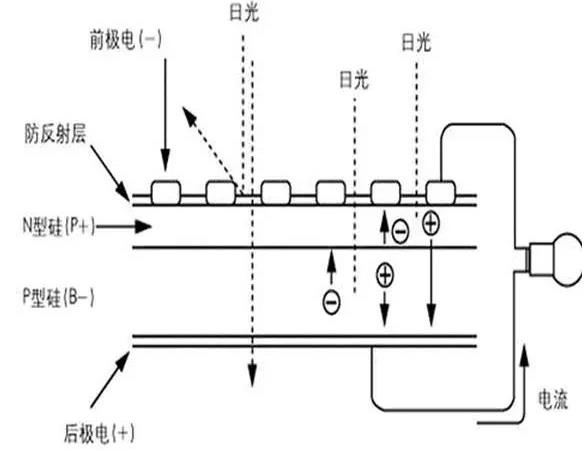 多晶硅太陽(yáng)能電池芯片是具有光電效應(yīng)的半導(dǎo)體器件,半導(dǎo)體的PN結(jié)被光照后產(chǎn)生電流,當(dāng)光直射太陽(yáng)能電池芯片,其中一部分被反射,一部分被吸收。一部分透過電池芯片、被吸收的光激發(fā)被束縛的高能級(jí)狀態(tài)下的電子,使之成為自由電子,這些自由電子在晶體內(nèi)向各方向移動(dòng),余下空穴(電子以前的位置)。空穴也圍繞晶體飄移,自由電子(-)在N結(jié)聚集,空穴(+)在P結(jié)聚集,當(dāng)外部環(huán)路被閉合,電流產(chǎn)生。