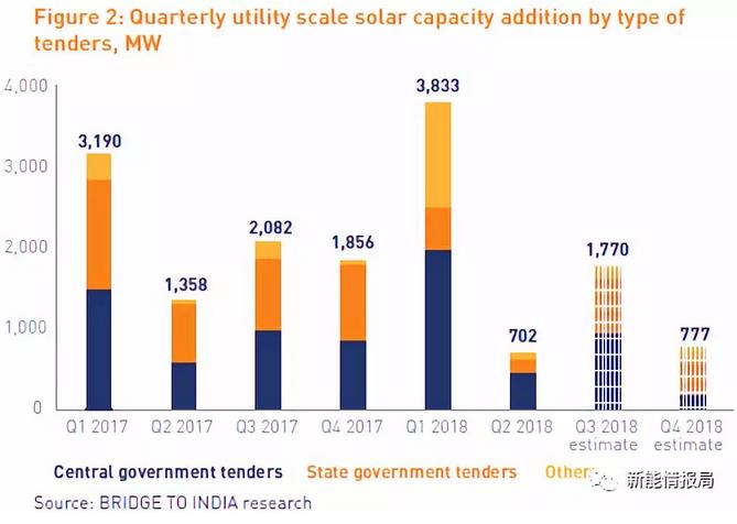 光伏電池和組件的保障關稅可能會導致大量開發商在下一年放緩項目的建造速度。Bridge to india預計2018年第三季度的裝機規模約為1.77GW,第四季度為777MW。