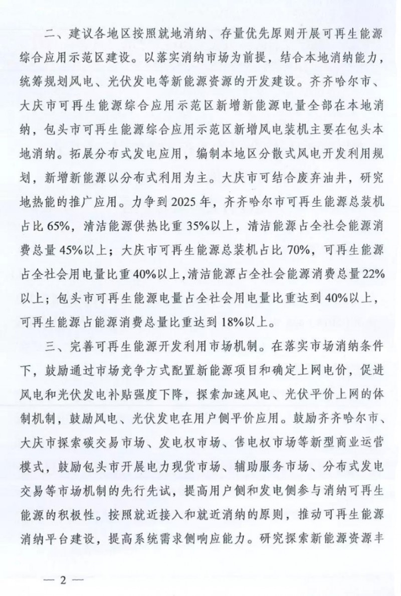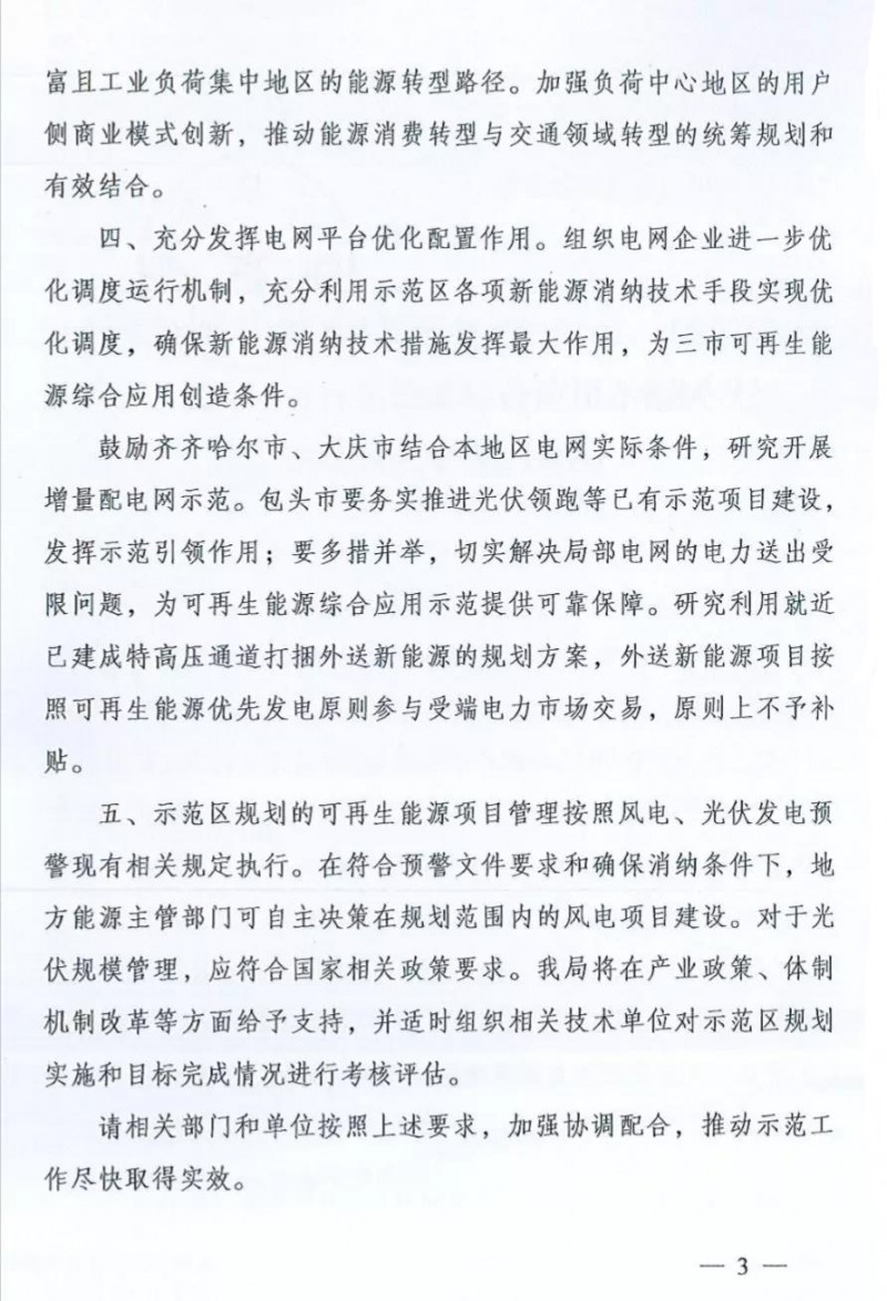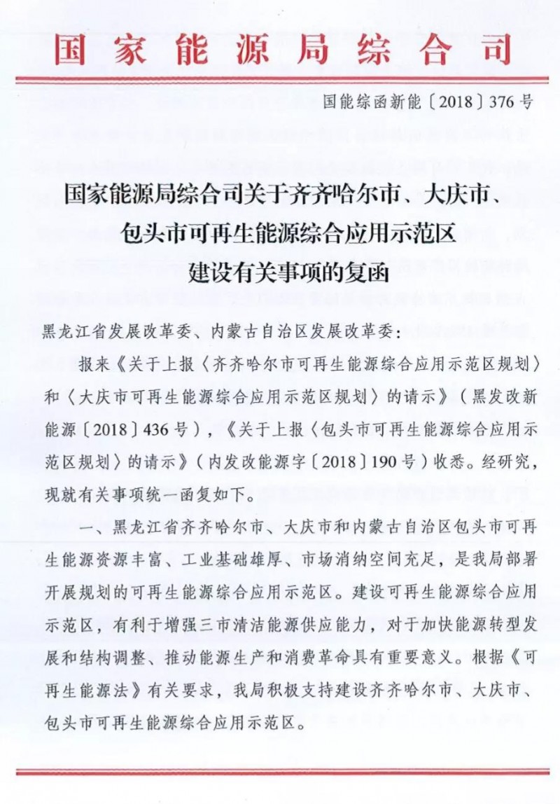 復函指出,建議各地區(qū)按照就地消納、存量優(yōu)先原則開展可再生能源綜合應用示范區(qū)建設。據(jù)悉,每個城市規(guī)劃了三年1.5GW的光伏發(fā)電規(guī)模(具體數(shù)字和實施方案有待各城市公布),對每年的發(fā)展規(guī)模未做限制;風電規(guī)模未知。齊齊哈爾市、大慶市可再生能源綜合應用示范區(qū)新增新能源電量全部在本地消納,包頭市可再生能源綜合應用示范區(qū)新增風電裝機主要在包頭本地消納。