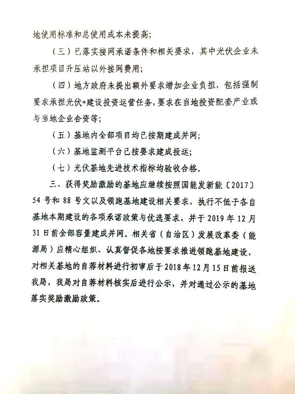 此外,獲得獎勵激勵的基地應(yīng)繼續(xù)按照要求,執(zhí)行不低于各自基地本期建設(shè)的各項承諾政策與優(yōu)選條件,并于2019年12月31日前全部容量建成并網(wǎng)。