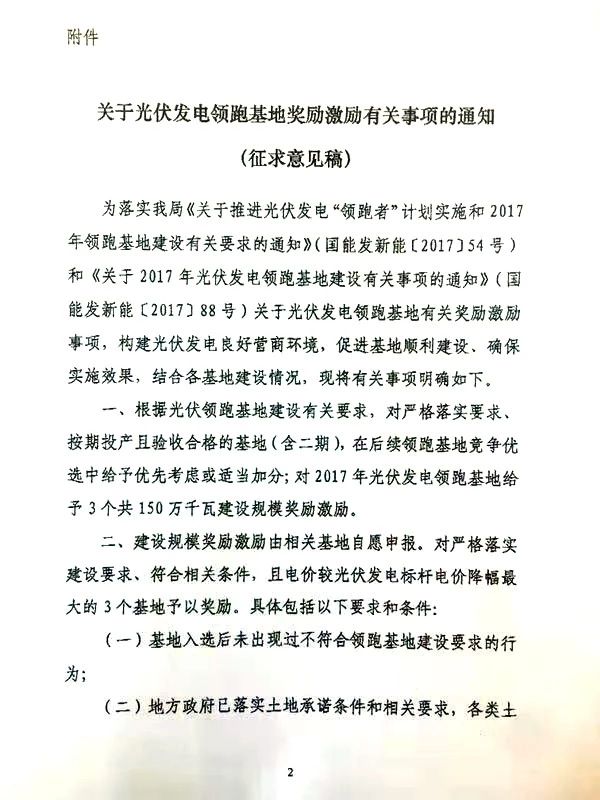 《通知》指出,對嚴(yán)格落實要求、按期投產(chǎn)且驗收合格的基地(含二期),在后續(xù)領(lǐng)跑基地競爭優(yōu)選中給予優(yōu)先考慮或適當(dāng)加分;對2017年光伏發(fā)電領(lǐng)跑基地給予3個共150萬千瓦建設(shè)規(guī)模獎勵激勵。