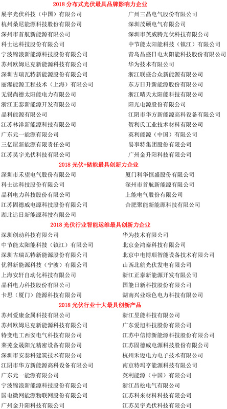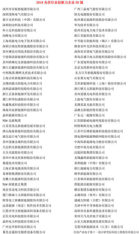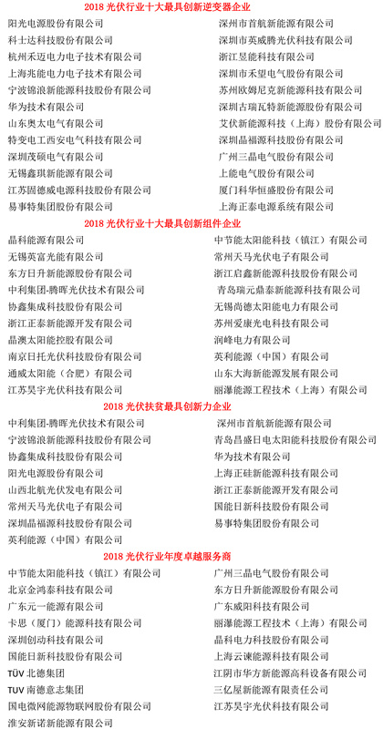 「PV TOP 50」2018光伏行業創新力企業50強暨各大單項獎入圍企業名單: