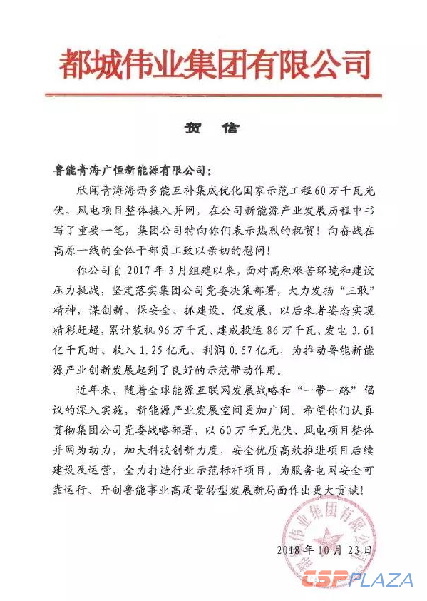 10月23日,魯能集團公司發來賀信,祝賀魯能海西多能互補集成優化國家示范工程60萬千瓦光伏、風電項目并網發電,指出項目并網在魯能集團新能源產業發展歷程中書寫了重要的一筆,并向奮戰在高原的公司全體員工致以親切的慰問。