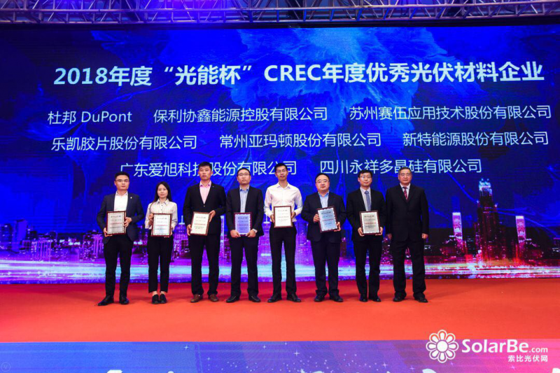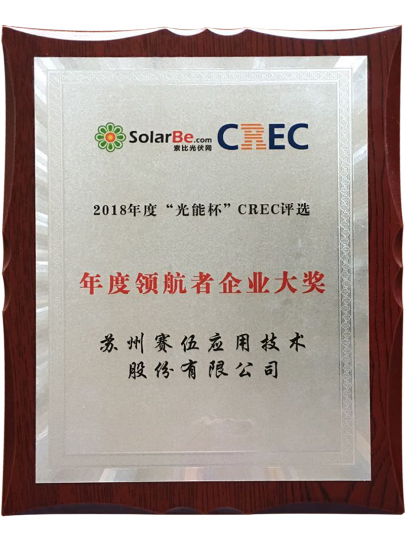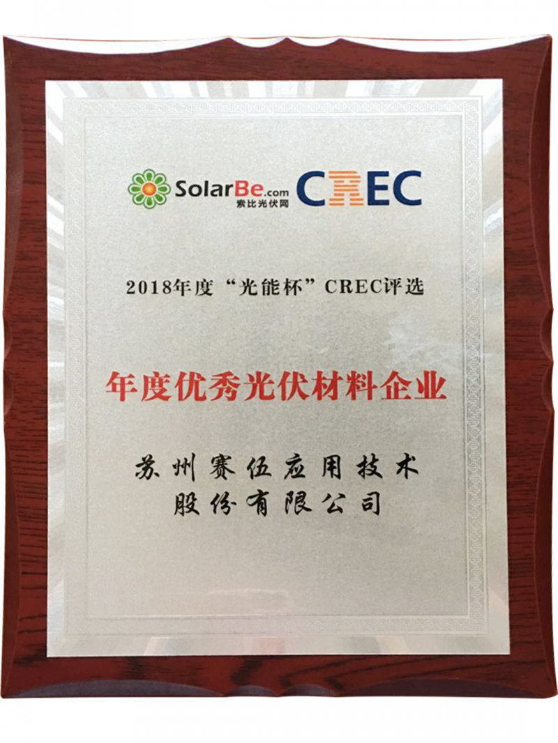 2018年度“光能杯“評選活動主旨以十年來國內(nèi)光伏行業(yè)發(fā)展技術(shù)、市場、產(chǎn)品、工藝等為背景細(xì)數(shù)光伏行業(yè)最佳技術(shù)成就、最佳企業(yè)展示、最佳團(tuán)隊、行業(yè)十佳企業(yè)領(lǐng)袖等。本次活動也吸引了中國光伏領(lǐng)域上百家重量級企業(yè)的積極參與。作為全球領(lǐng)先綜合高分子材料方案解決商,蘇州賽伍應(yīng)邀出席本屆盛會并豪攬“2018年度光能杯CREC年度領(lǐng)航者企業(yè)大獎”和 ”2018年度光能杯CREC年度優(yōu)秀光伏材料企業(yè)”雙料大獎。