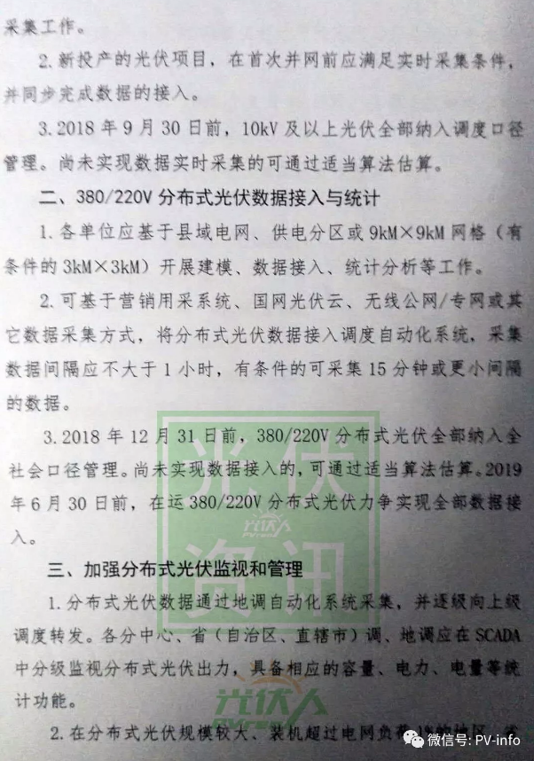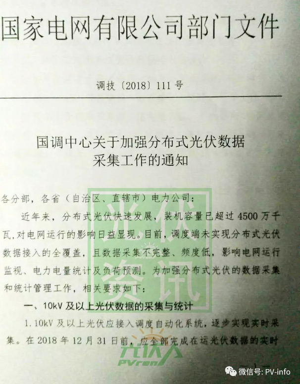 近日,國家電網有限公司發布《國調中心關于加強分布式光伏數據采集工作的通知》,10kV及以上光伏應接入調度自動化系統,逐步實現實時采集;2018年10月31日前,380/220V分布式光伏全部納入社會口徑管理,2019年6月30日前,在運380/220V分布式光伏力爭實現全部數據接入。