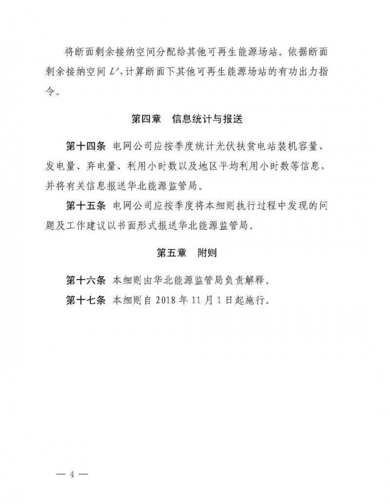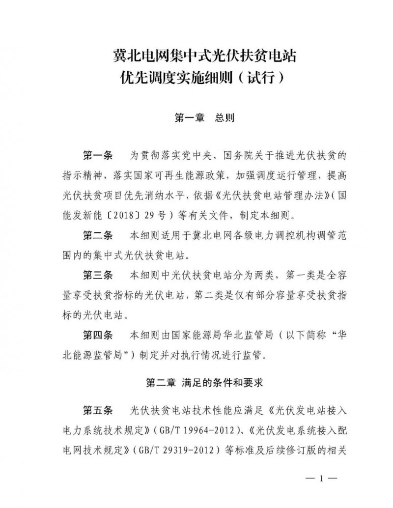 文件要求:華北電網有限公司,國網冀北電力有限公司,為貫徹黨中央、國務院關于打好扶貧攻堅戰的重要指示,積極落實光伏扶貧有關政策,進一步提高可再生能源消納水平,確保光伏扶貧項目電量優先消納,國家能源局華北能源監管局組織制定了《冀北電網集中式光伏扶貧電站優先調度實施細則(試行)》。經向有關電力企業征求意見,現予印發,請相關單位于2018年11月1日起執行。 執行中如遇重大問題,請及時報告我局。