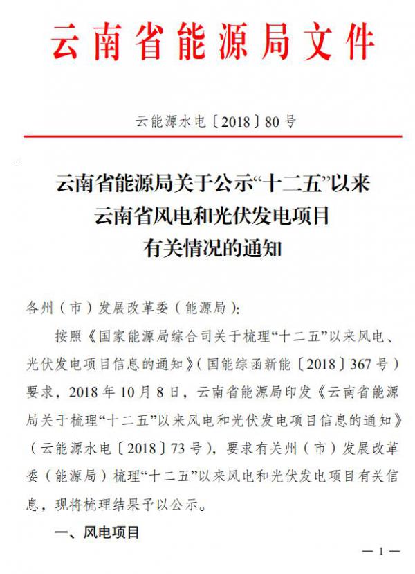 近日,云南省能源局發(fā)布《關(guān)于公示梳理“十二五”以來云南省風(fēng)電和光伏發(fā)電項目信息的通知》,公示時間為11月1日至11月9日。