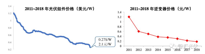 圖:2011——2018年光伏組件、逆變器的價(jià)格變化趨勢(shì)