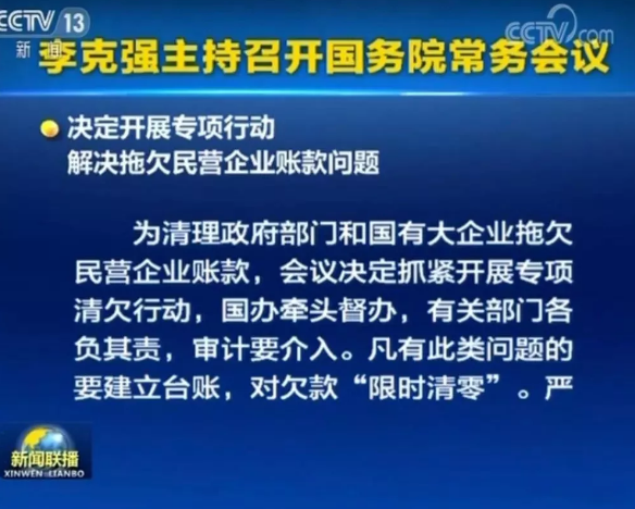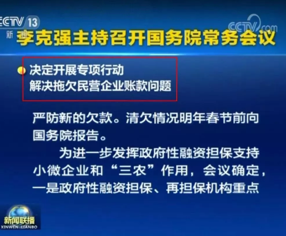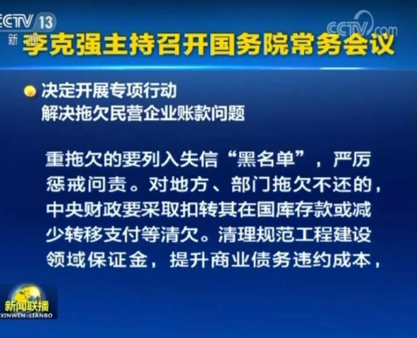 為清理政府部門和國有大企業拖欠民營企業賬款,會議決定抓緊開展專項清欠行動,國辦牽頭督辦,有關部門各負其責,審計要介入。凡有此類問題的要建立臺賬,對欠款“限時清零”。嚴重拖欠的要列入失信“黑名單”,嚴厲懲戒問責。對地方、部門拖欠不還的,中央財政要采取扣轉其在國庫存款或減少轉移支付等清欠。清理規范工程建設領域保證金,提升商業債務違約成本,嚴防新的欠款。清欠情況明年春節前向國務院報告。
