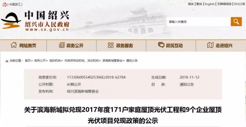 分布式光伏發電應用扶持政策實施細則》(紹濱海委〔2016〕37號)等文件規定,落實政策兌現,發電量由袍江電力部門提供。其中171戶家庭屋頂光伏工程,按其實際發電量給予0.2 元/千瓦時的補貼,補貼期限為自發電之日起五年(之前并網發電的自本政策執行之日2017年6月起補貼五年);9個企業屋頂光伏發電項目兌現相關政策,主要包括以下三部分:項目投資補助(5%*不含稅工程造價)、發電量補助(0.2 元/千瓦時)、屋頂業主補助(2元/平方米)。兌現政策的明細見附件。現按照要求進行公示,公示期限為2018年11月12日至11月21日(7個工作日),如有意見,請及時向我們反映,聯系電話:0575-89175531,聯系人:徐先生。