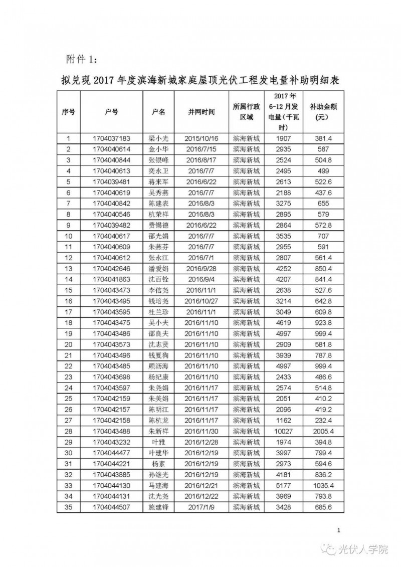 附件1:擬兌現2017年度濱海新城家庭屋頂光伏工程發電量補助明細表