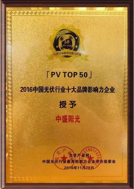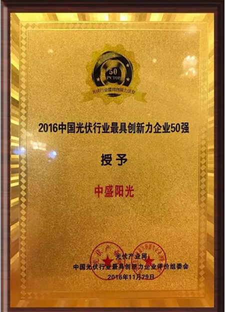 中盛從眾多候選企業中脫穎而出,榮膺“2016中國光伏行業十大品牌影響力企業”及“2016中國光伏行業最具創新力企業50強”。