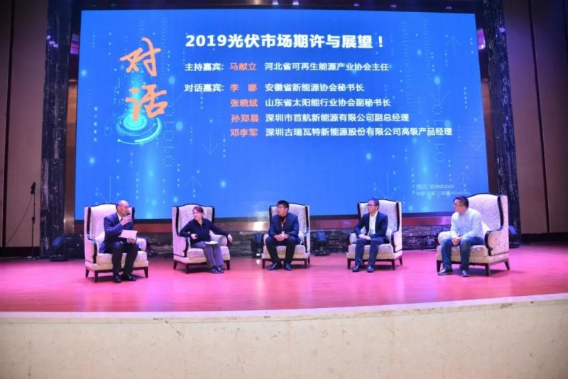 在河北省可再生能源產業協會主任馬獻立的主持下,安徽省新能源協會秘書長李娜、山東省太陽能行業協會副秘書長張曉斌、深圳市首航新能源有限公司副總經理孫鄭晨、深圳古瑞瓦特新能源股份有限公司高級產品經理鄧李軍等人就“2019光伏市場期許與展望”為主題進行了對話。李娜秘書長、張曉斌秘書長和馬獻立主任分別就安徽、山東、河北省的產業發展情況和協會下一步的工作進行了細致的講述;孫鄭晨先生和鄧李軍先生圍繞各自企業現階段的工作以及未來的發展方向進行了討論。在對話環節的最后,參會人員也紛紛就領跑者基地、戶用市場等問題向對話嘉賓進行了現場提問。