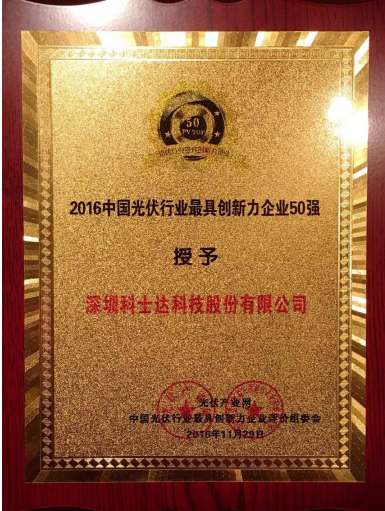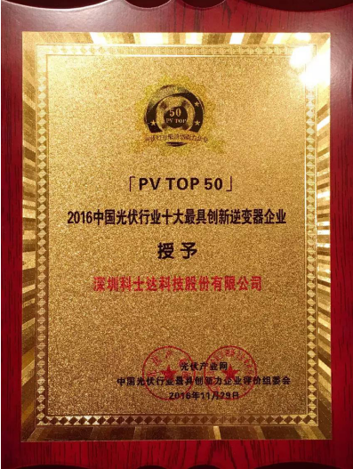 憑借優(yōu)秀的出貨量、卓越的技術(shù)創(chuàng)新和較高的市場(chǎng)口碑,深圳科士達(dá)榮獲“2016十大最具創(chuàng)新逆變器企業(yè)”,“2016中國(guó)光伏行業(yè)最具創(chuàng)新企業(yè)50強(qiáng)”,公司董事長(zhǎng)劉程宇先生獲得“行業(yè)創(chuàng)新領(lǐng)軍人物獎(jiǎng)”。
