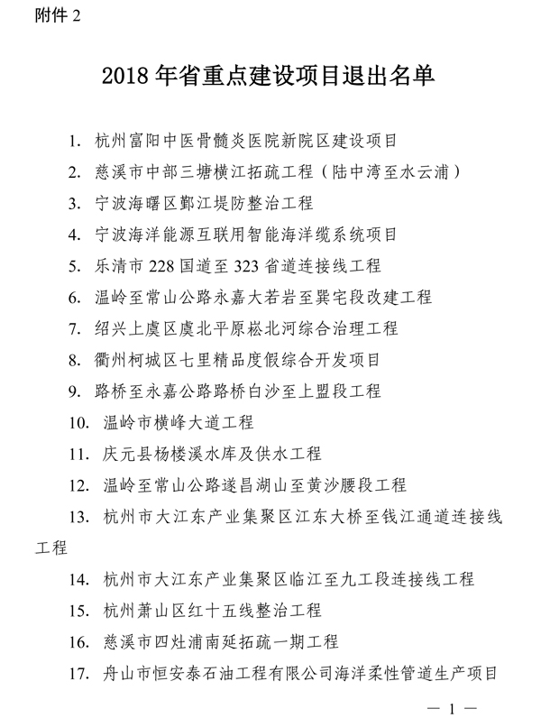 經省政府同意,現將2018年省重點建設項目增補和退出名單印發給你們。本次增補的省重點建設項目89個,總投資1608億元,43個項目退出省重點建設項目名單,總投資585億元。各地、各部門和有關單位要按照《浙江省重點建設項目管理辦法》(省政府令第270號),積極做好項目開工建設的各項要素保障和服務協調工作,確保項目在年內盡快開工建設,并按計劃完成年度投資目標。