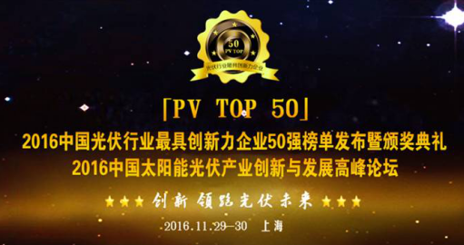 “2016中國光伏行業最具創新力企業榜單發布暨頒獎典禮(PV TOP 50)”由光伏產業網組織發起、中國智能光伏產業技術創新戰略聯盟協辦,以“創新 領跑光伏未來 ”為年度主題,用專業、權威的價值視野,倡導創新進取,尋找本年度的“最具創新”標桿企業,旨在表彰受光伏市場認可,具有突出創新力的行業產品和技術,表彰年度為中國光伏行業發展做出重大貢獻的企業,通過「PV TOP 50」的平臺提升參選產品、技術及企業在光伏市場的品牌影響力,真正推動中國光伏市場的創新與可持續發展。
