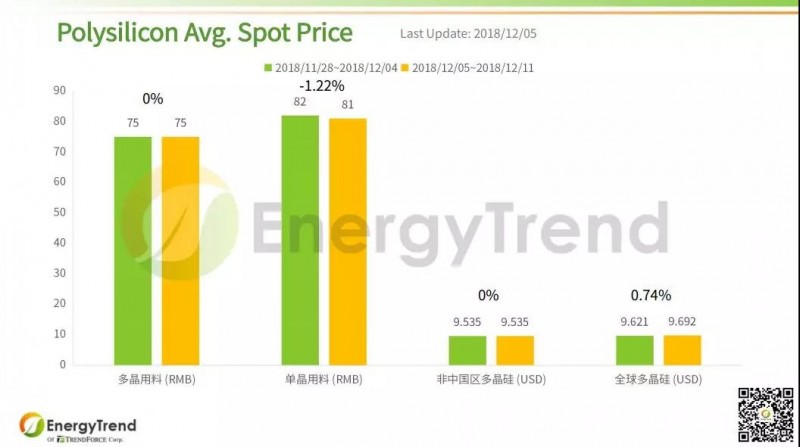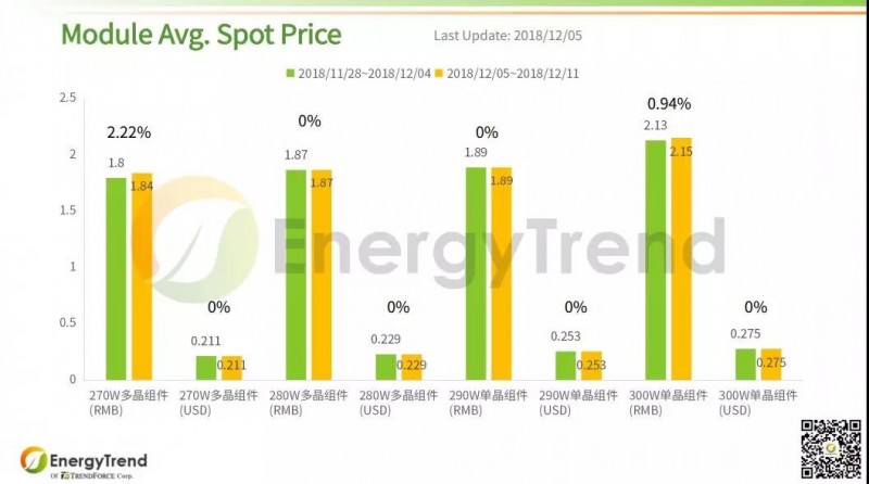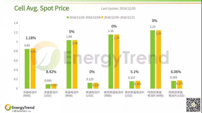 12月5日的報價顯示,常規多晶電池片人民幣價格從 RMB0.85/W 上漲至 RMB0.856/W,漲幅是 1.18%;美金價格從 US$0.095/W 來到 US$0.103/W,增長了 8.42%。常規單晶電池片的人民幣均價和美金均價為 RMB1.04/W 和 US$0.125/W,維穩不變。高效單晶電池片人民幣報價也保持不變,為 RMB1.16/W;其先前的美金報價為 US$0.157/W,最新一周增長了 5.1% 來到 US$0.165/W。特高效單晶電池片的人民幣維穩在 RMB1.25/W;美金均價為 US$0.175/W,較之前的 US$0.165/W上漲了 6.06%。