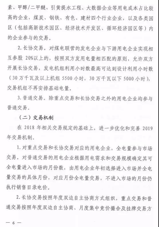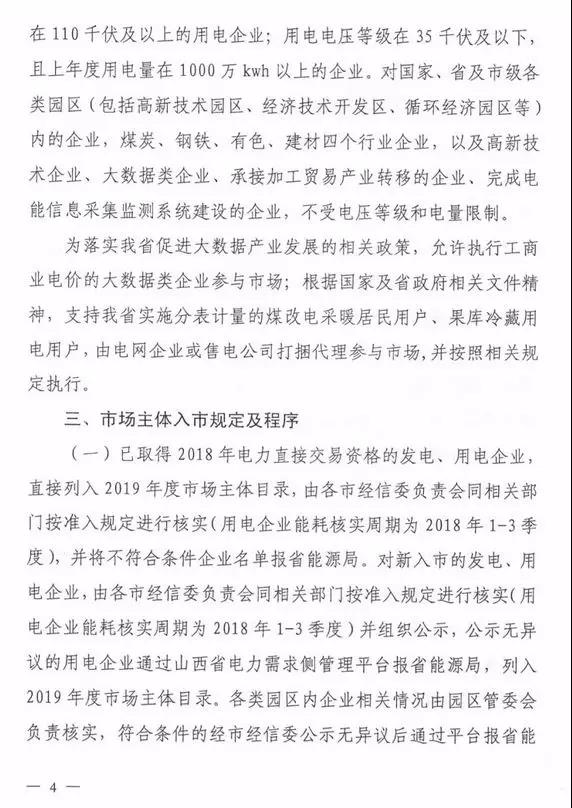 《方案》明確:進一步放寬大工業用電企業參與市場的范圍:用電電壓等級在110千伏及以上的用電企業;用電電壓等級在35千伏及以下且上年度用電量在1000萬kwh以上的企業,對國家,省及市級各類園區(包括高新技術因區、經濟技術開發區、循環經濟園區等)內的企業,煤炭、鋼鐵、有色、建材四個行業企業,以及高新技術企業、大數據類企業、承接加工貿易產業轉移的企業,完成電能信息采集監測系統建設的企業,不受電壓等級和電量限制。